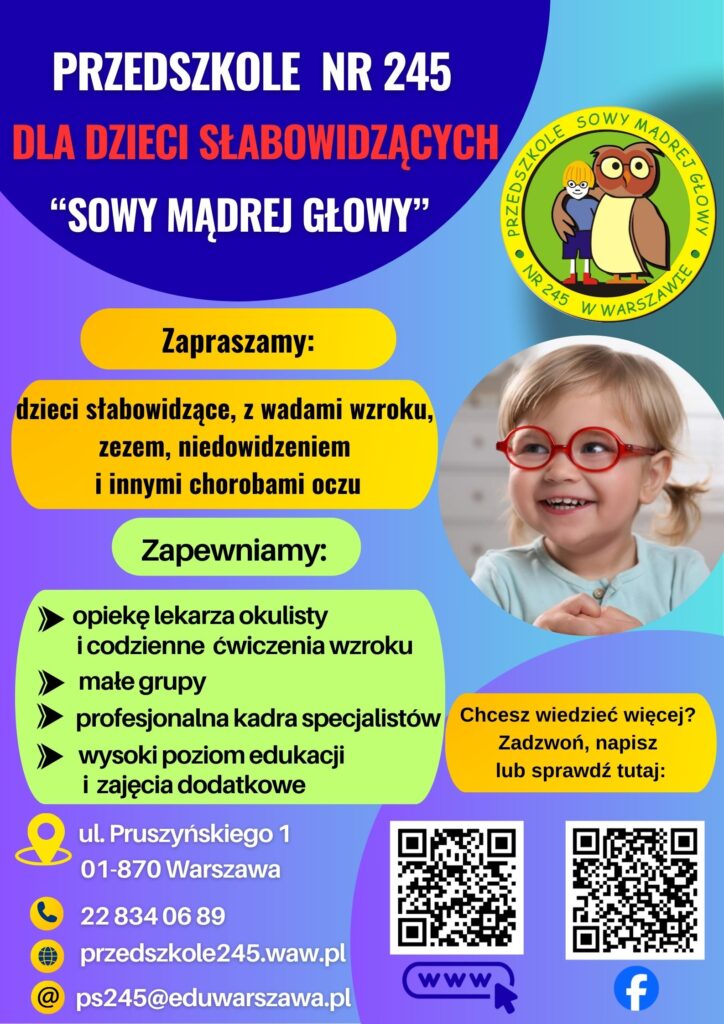 31 marca 2026 r. rozpoczyna się rekrutacja do przedszkoli specjalnych, czyli również do Przedszkola Nr 245 dla Dzieci Słabowidzących „Sowy Mądrej Głowy”.
